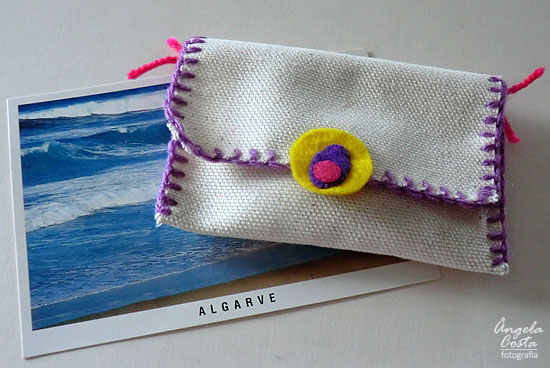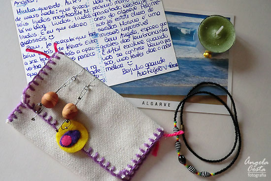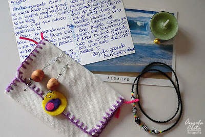 Um postal das suas férias no Algarve e uma bolsa com um colar, uns brincos e uma velinha de cheiro :)
